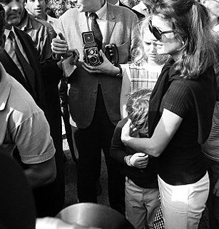 Following the President’s funeral, Jackie stands as John salutes his father’s casket, 1963, mimicking a military honor guard.