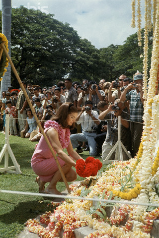 Jackie Kennedy and Cambodian Prince Norodom Sihanouk unveiling a plaque of an avenue named for President Kennedy, 1967.