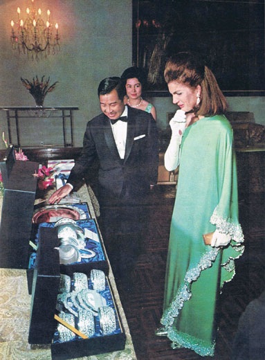 Prince Norodom Sihanouk shows Jackie Kennedy the lavish gifts he government was presenting her during her 1967 Cambodian visit.