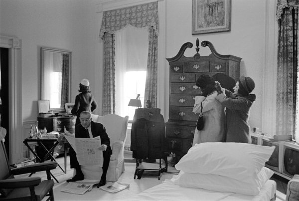 As Mrs. Johnson helped daughter Lynda with her coat, and daughter Luci checked out her appearance in a mirror, LBJ was reading the paper.